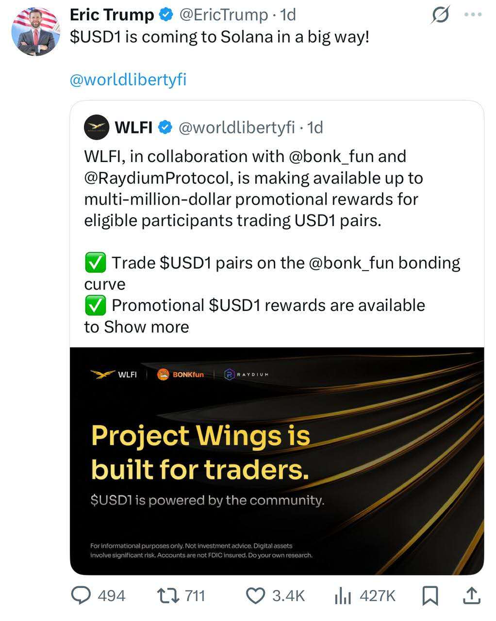特朗普与 BONK 合作,进军 Solana美国总统唐纳德·特朗普的儿子埃里克·特朗普(Eric Trump)宣布,World Liberty Financial($WLFI)将与 BONK (@bonk_inu) , BONK.fun 和 Raydium合作,携带 $USD1 登陆 Solana。